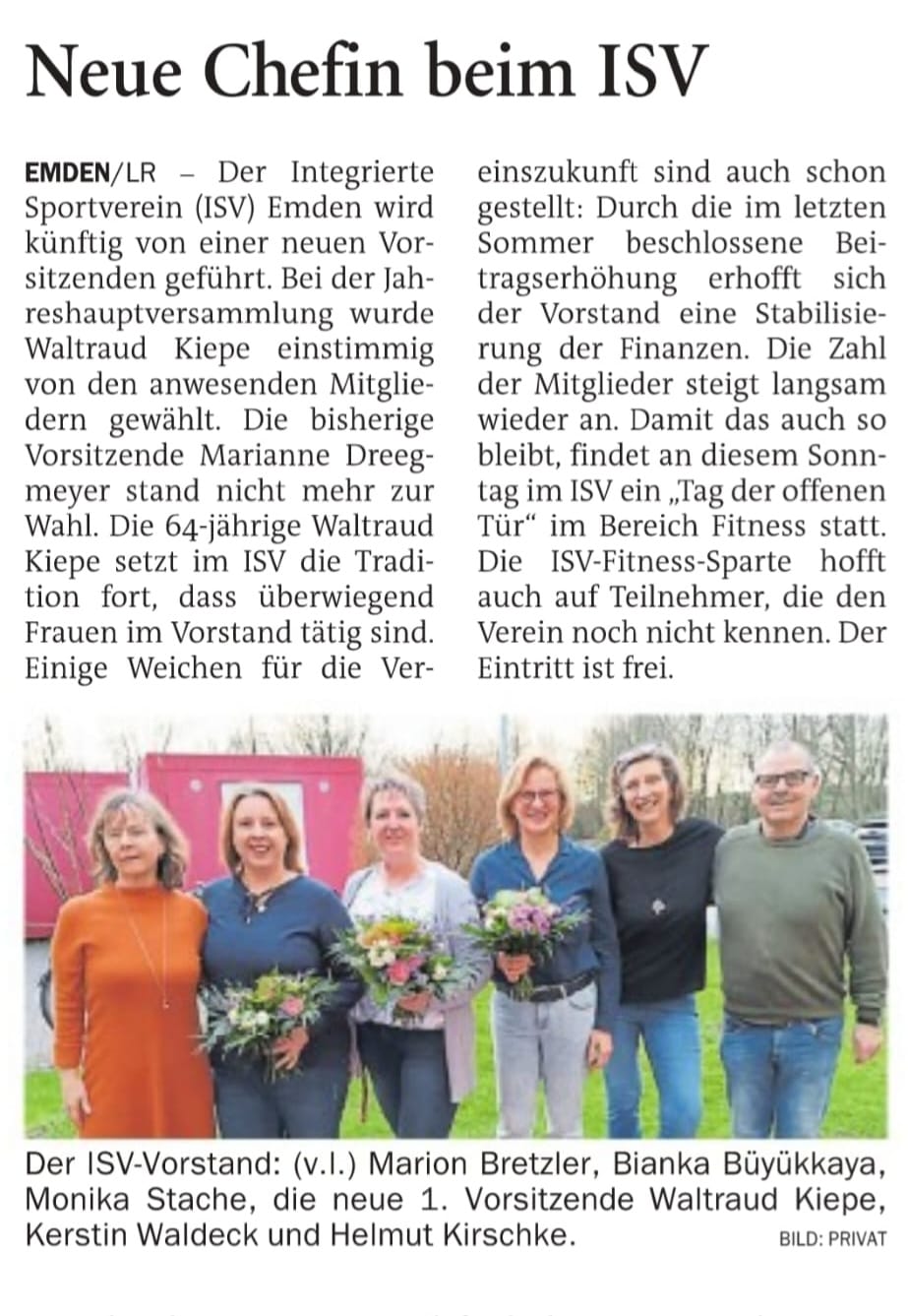 Der Integrierte Sportverein (ISV) Emden wird künftig von einer neuen Vorsitzenden geführt. Bei der Jahreshauptversammlung wurde Waltraud Kiepe einstimmig von den anwesenden Mitgliedern gewählt.